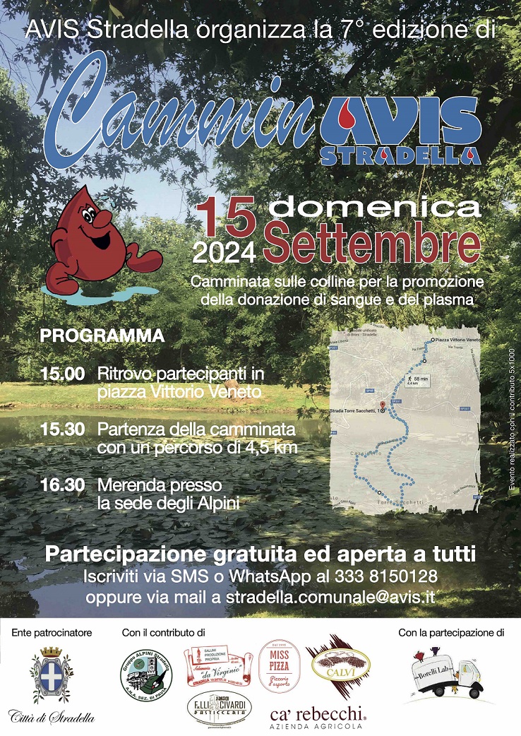 Nel pomeriggio di domenica 15 settembre AVIS realizzerà la 7° edizione di CamminAVIS , la camminata per le colline di Stradella finalizzata alla promozione della donazione di sangue e di plasma.