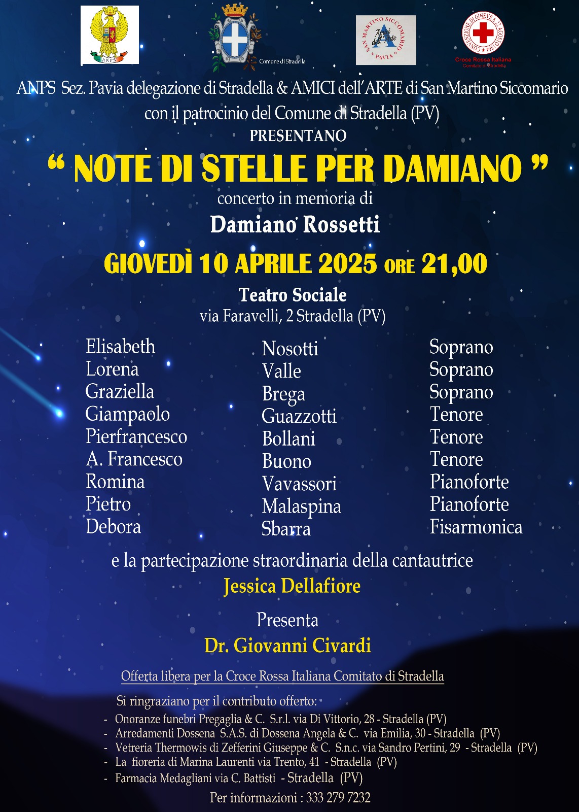 Descrizione Concerto "Note di Stelle per Damiano" con offerta libera per Croce Rossa Italiana Comitato di Stradella Allegati Documenti Locandina [.jpg 421,19 Kb - 14/03/2025] A cura di Servizio Demografico Ultimo aggiornamento pagina: 15/05/2025 16:10:54